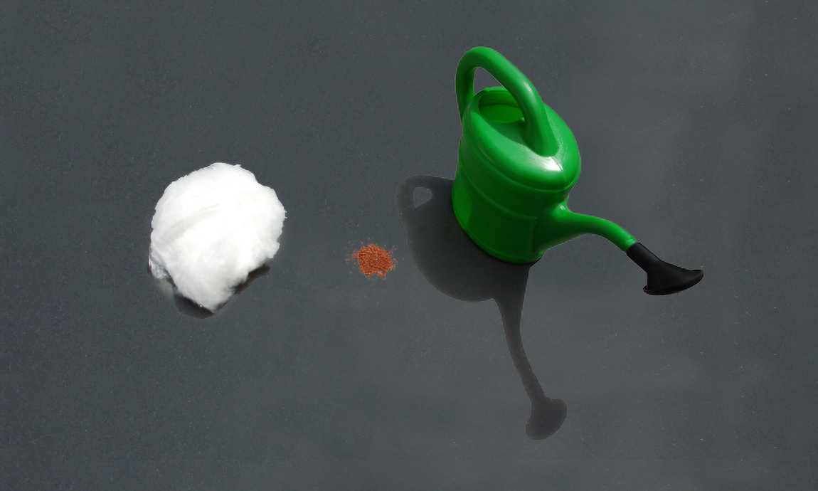 Watte gleichmäßig im Keimkasten verteilen und einnässen – Feuchte Watte plattdrücken und Kressesamen nach Gusto auf der Watte verteilen.