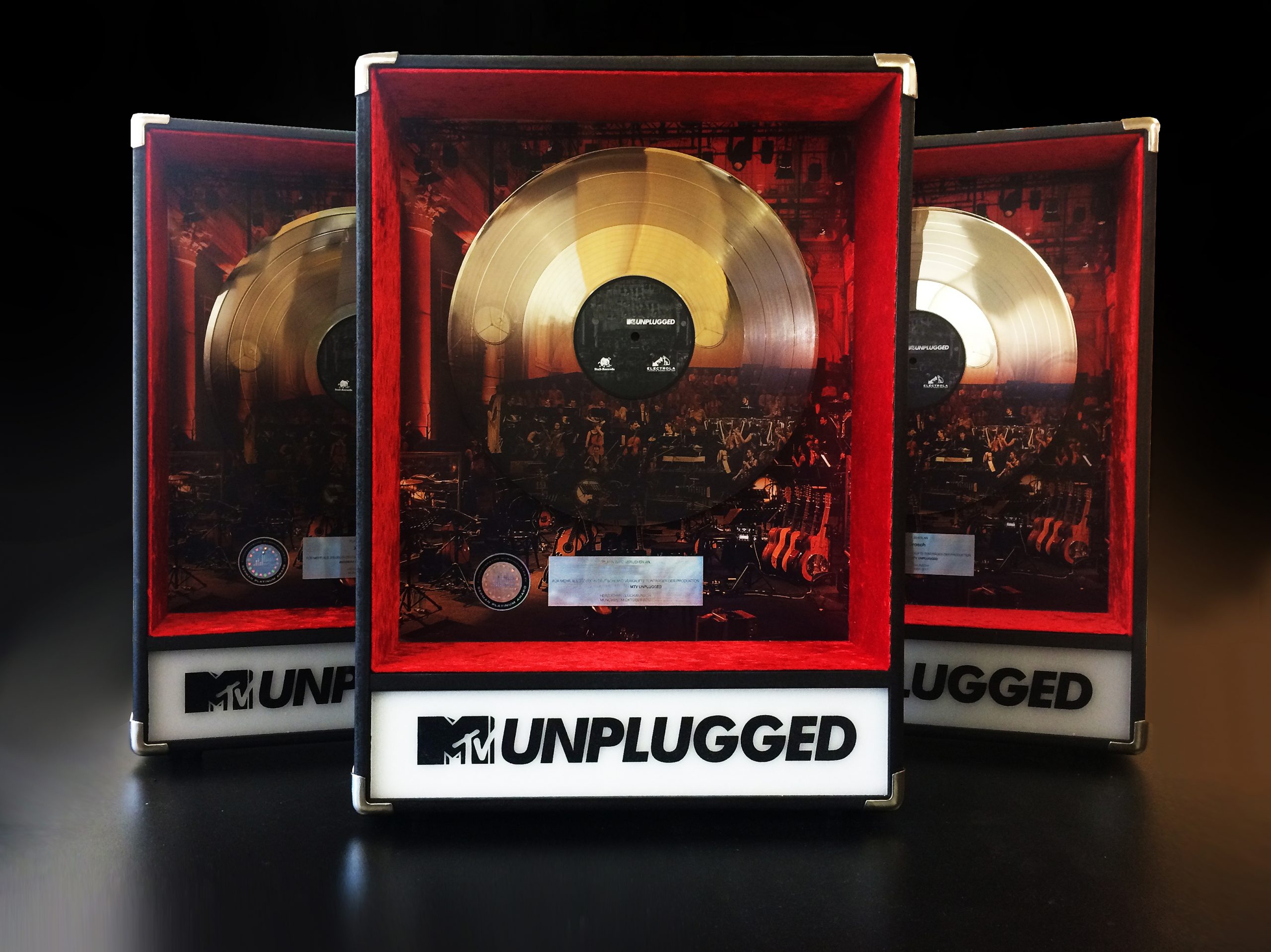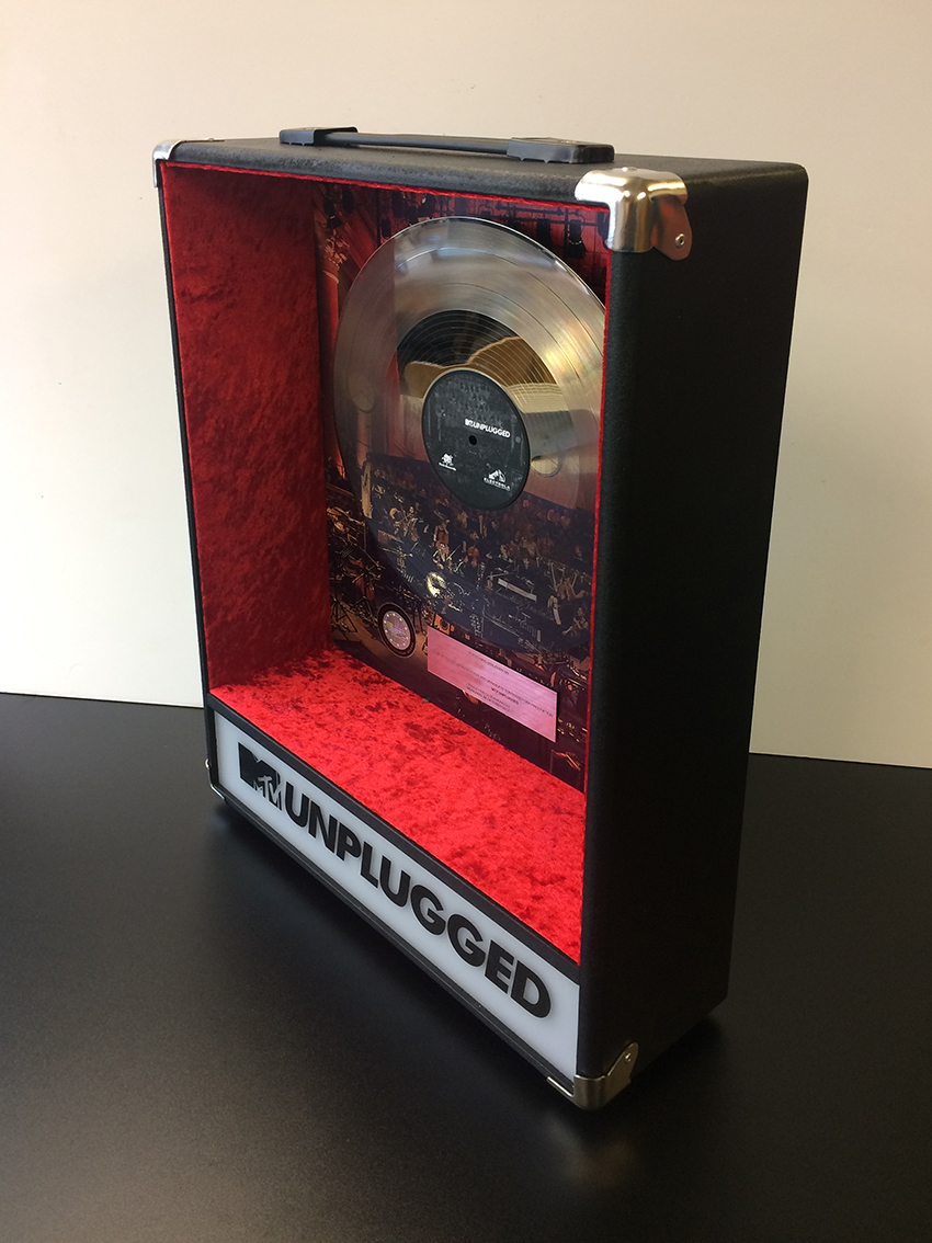 Hier zu sehen ein Platinaward für eine MTV-Unplugged Produktion – Der Award ist eine Mischkreation aus einem mit Samt ausgeschagenem Instrumentenkoffer und einer Stagebox, bzw eines Verstärkers. Integriert ist ein kleiner Leuchtkasten mit MTV-Logo.