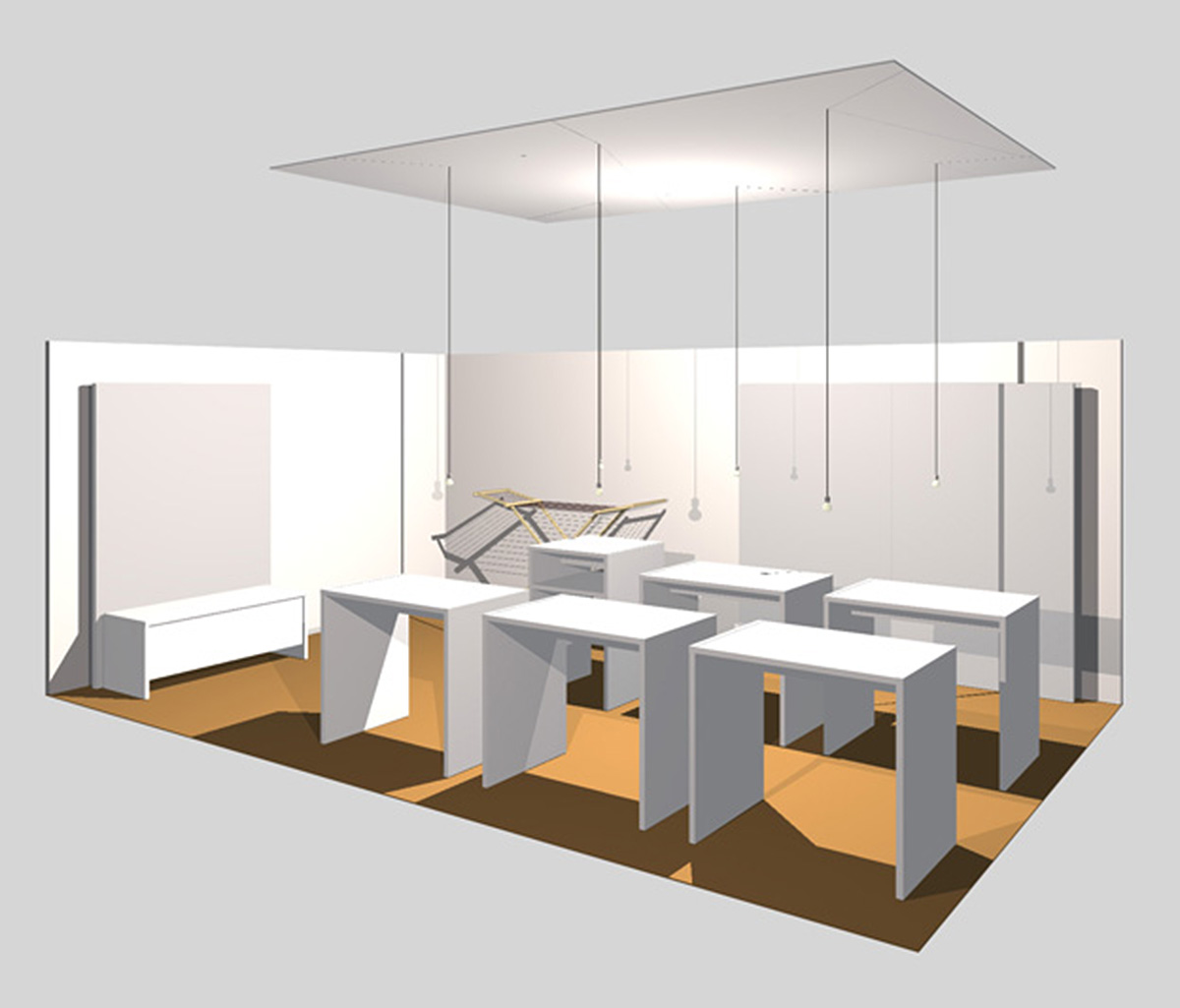 Im folgenden zu sehen: Wäscheständer “MAMA” – Klammernbeutel “FILIUS” – Bügelbrett “AU PAIR ” – Schneidebrett “BASEBOARD” und die Visualisierung des ersten Messestandes für die Messe Frankfurt